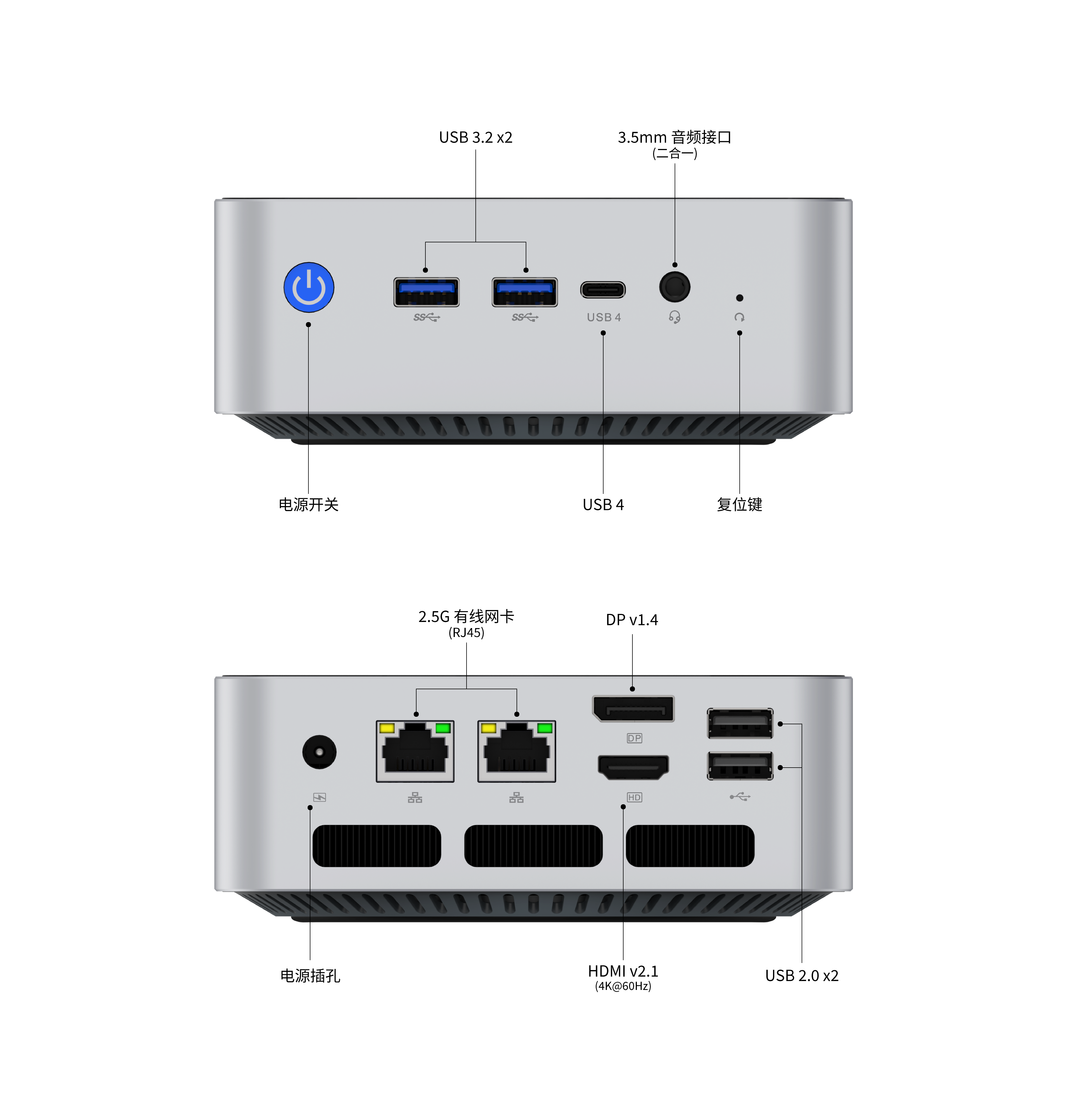 l/O Ports:HDMI*1,DP*1,M.2 2280*2 Smart Fan*1,USB2.0*2,USB3.2*2,USB4*1,Audio Jack*1,DC Jack*1,Rj45*2